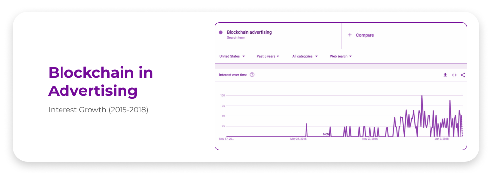 Meanwhile, an increased interest in blockchain has been vivid on all kinds of media, social networks, and economic forums so the subject inevitably penetrated ad tech. However, as Google Trends illustrates, the real rise of the topic’s popularity could be observed starting from 2016 until the time when the first blockchain-based ad platforms were launched on the market.