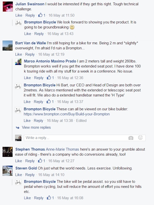 Over on Facebook, Brompton Bicycle combines more detailed text descriptions with photographs and links to promote Brompton’s projects and media coverage. Facebook’s commenting system, without the constraints of Twitter’s character limit, makes posts more conversation-heavy, and Brompton doesn’t miss out on the opportunity to join in the conversation.