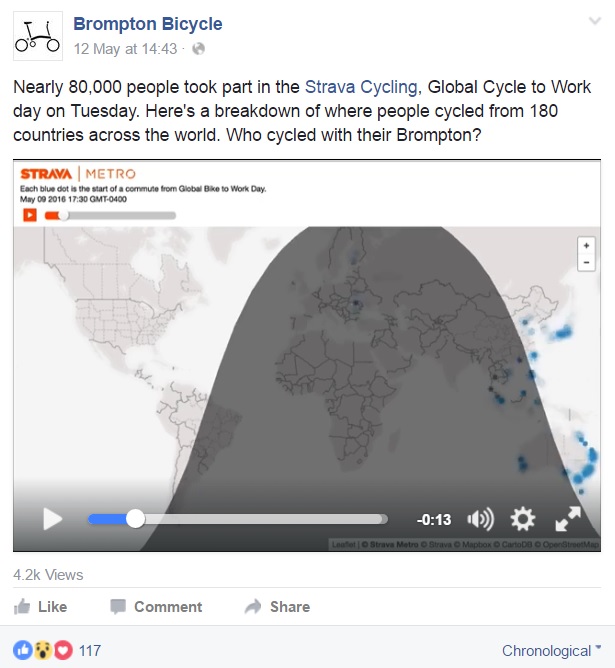 For example, on Strava’s (a social network for athletes) Global Cycle to Work Day, Brompton Bicycle encouraged users on Facebook, Twitter and Instagram to join the Brompton Club on Strava and share their commute, tagging @BromptonBicycle on social media. Later on Facebook, Brompton shared a dynamic data visualization that Strava had created to map the commutes of everyone across the world who took part in the day.
