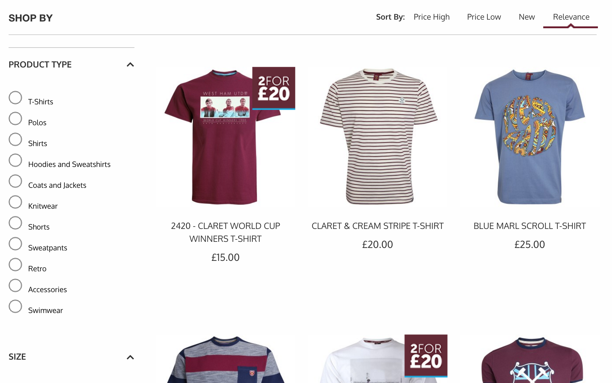 West Ham’s site gets the first part right, with clear filtered navigation to allow customers to narrow their product selection by size, product category, price etc.