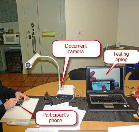 A common scenario for a user test would be: a camera (ideally a document camera) videos how the user interacts with the site/app on their device and sends this to a monitoring computer. This is often accompanied by the user describing what they are doing – known as thinking aloud.